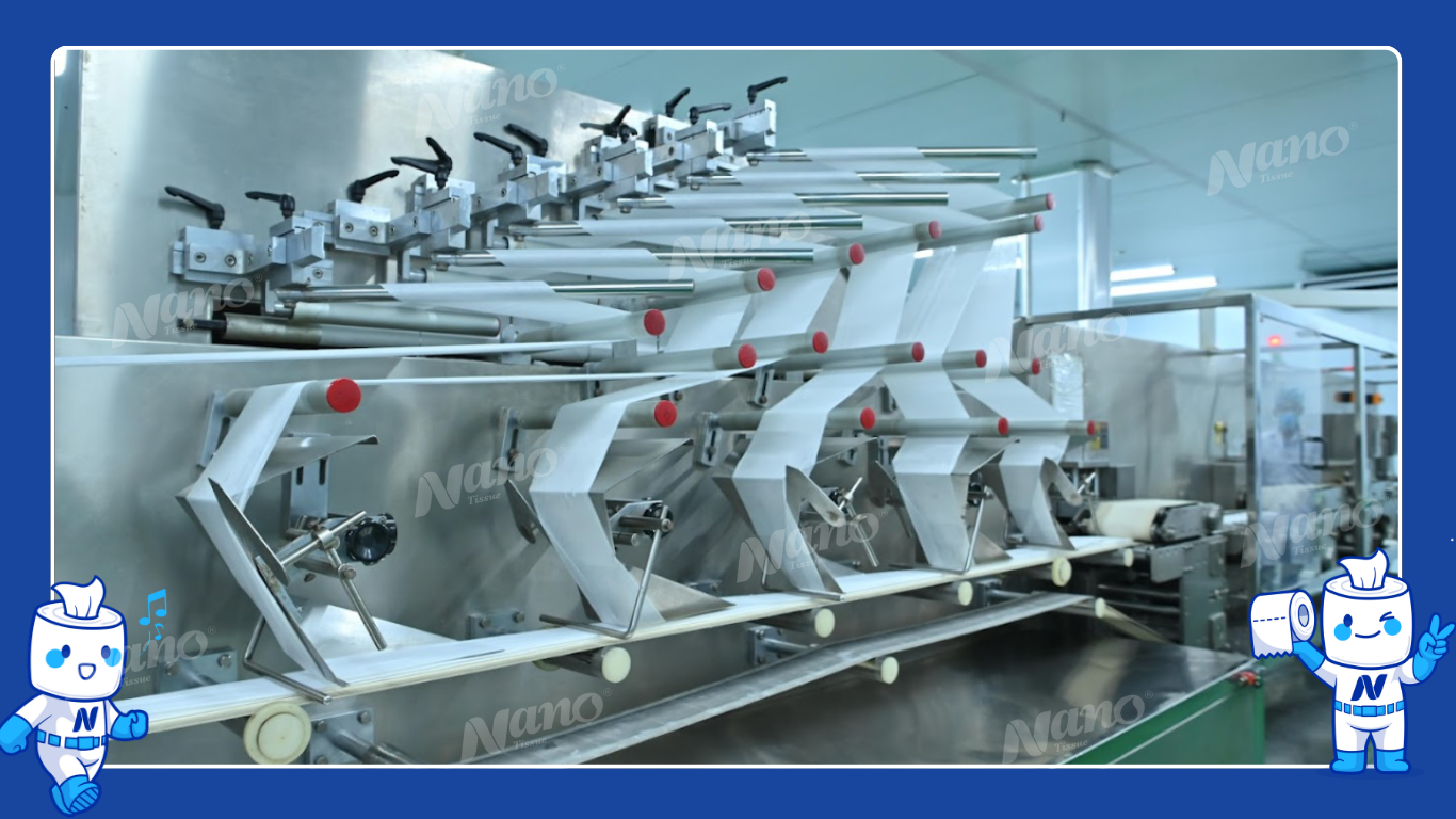 Giai đoạn sản xuất hàng loạt là lúc toàn bộ hệ thống máy móc vận hành. Vải được cắt, tẩm dung dịch, gấp và đóng gói tự động. Đây là công đoạn chiếm nhiều thời gian nhất, thường từ 2 đến 5 ngày, tùy vào số lượng đơn hàng và công suất nhà máy.